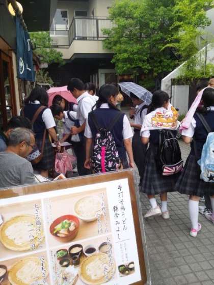そろそろ、お昼ご飯の時間です。 この班は、手打うどんのお店に決めたようです。