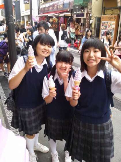 事前学習の鎌倉テストで優勝した班が、ソフトクリームを食べています。