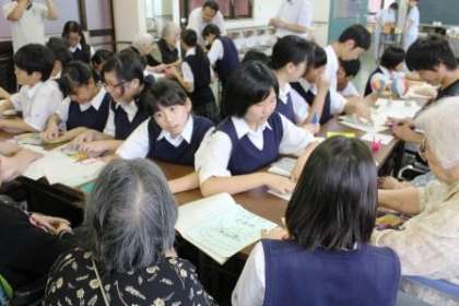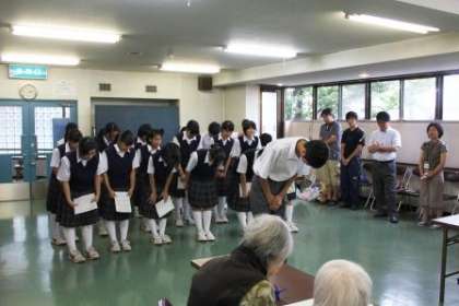 25年度前期生徒会活動。1枚目は、地域清掃ボランティアに集まった「心ある有志」の集合写真です。2、3枚目は、申孝園交流ボランティアの写真です。11年目を迎えるお年寄りの施設訪問。今年は、午前中の地域清掃に引き続き、午後に訪問しました。今回は、みやざわけんじの詩を朗読プレゼントしました。