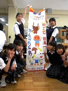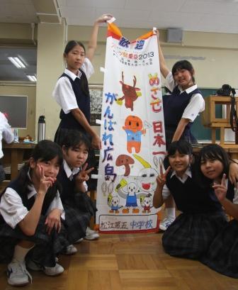 今年は東京国体。東京を訪れる道府県チームを応援するために応援旗をつくってくれました。広島県の方々が悔いのないよう、思いっきり競技できるよう気持ちを込めた応援旗です。なかなかいい出来です。