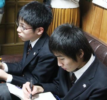 写真は、村井さんが、真剣な表情でお話をしてくださっている写真。生徒会長も写っているシーン。メモを取りながら真剣にお話を聞く生徒会役員の写真です。