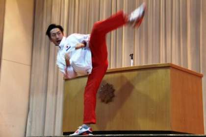 本校で、長い間学級指導員としてお世話になった大嶋幹夫さん(本校の卒業生)が、空手の世界選手権で、銅メダルをとりました。写真は、メダル獲得をお祝いして、大嶋さんに講演をしていただきました。これまでのたゆまぬ努力やこれからの抱負などを語っていただきました。写真は、講演の様子(胸にかけた銅メダル)、会場で本校の丸山先生と撮った写真、披露していただいた技の写真の順です。