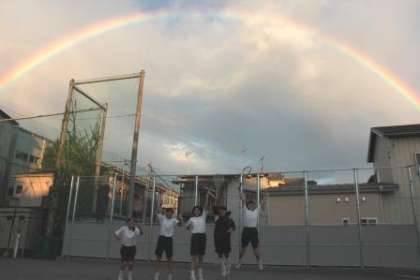 テニス部の練習中に虹が出ました。きれいです。生徒と虹のナイスショット。