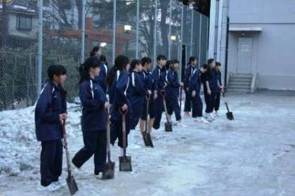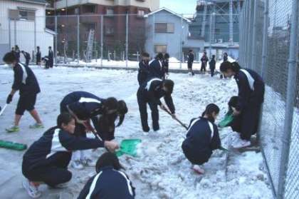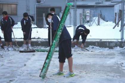 今日(2月15日)の雪ではありません。2月10日(月)の写真です。テニス部、サッカー部、バドミントン部の生徒と先生が、校庭の雪をきれいにしました。おかげで授業や部活動ができるようになりました。