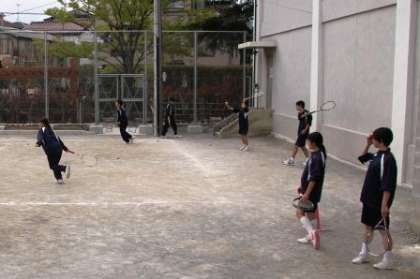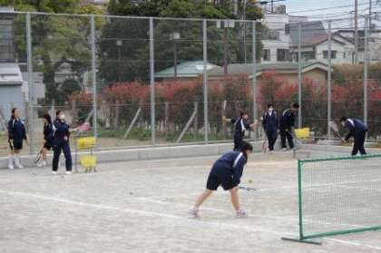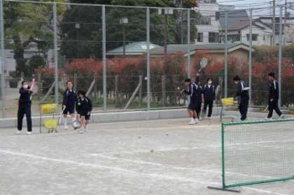 ソフトテニス部は、狭い校庭でいつも頑張っているなあと思ってみています。この日は、生徒どうしで、一方がボールを出して、もう一方がレシーブをするという練習を順番に回りながら行っていました。うまくキャッチできたり、タイミングが合わなかったりと、テニスも簡単なスポーツではありません。時々ビシッと返球できたときのタイミングやラケットの振り方を体で覚えていきます。コースもしっかり決められるようになるといいですね。春の大会では、今日の練習の成果を発揮してほしいです。