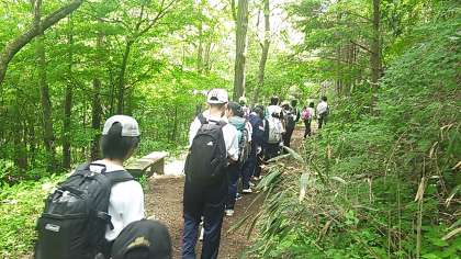 木漏れ日の中、登山が始まりました。今朝は、全員元気に朝食をとり、明るく登っています。次の写真は、顔を写します。