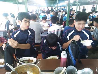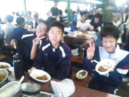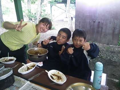 飯盒炊飯、カレーづくり。とても上手にできました。おいしい顔です。