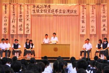 立会演説会の写真をご覧ください。どの候補も松越えの熱い想いや選挙公約をしっかり発表しました。諸先輩の築いてきた伝統を受け継ぎ、さらに発展させていくであろう新生徒会役員候補の姿に、頼もしさと安心感を覚えました。