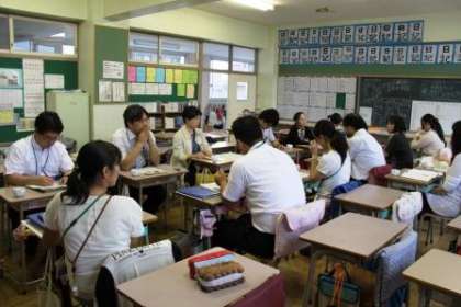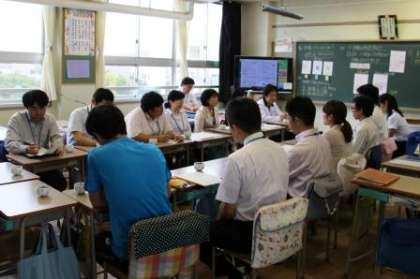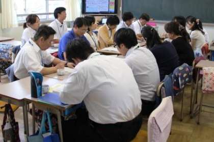 一之江小学校の先生方と、五中の先生方とで定期的に行われている研修会の様子です。学習指導、生活指導、行事などについて互いの学校の取組を報告し合ったり、意見交換して小学校と中学校の連携を深めています。