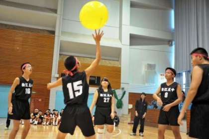 日本で発案された競技スポーツで、専用の風船を使い、ネットはバドミントンのネットを使います。1チーム6人から10人で編成し(今回は6人)、相手から撃たれたサーブを、味方全員がタッチして最後に、相手コートにアタック攻撃します。風船のゆっくりした動きや、強く打つと回転して思わぬ方向に行ってしまうなど、なかなか難しい競技です。