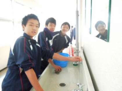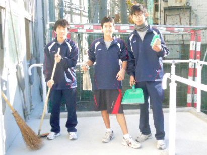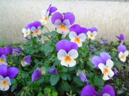 男子の写真。校門脇の花壇に咲く可憐なスミレの写真。