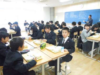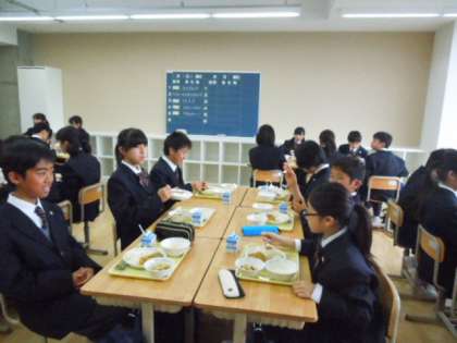 新校舎での給食風景です。 みんなおいしそうに食べています。