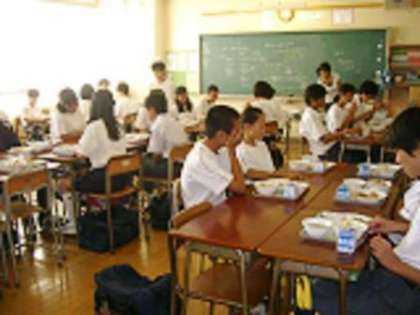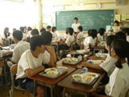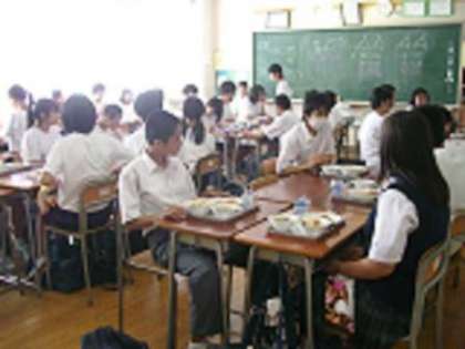 2年生の給食の様子です。給食当番を中心に生徒達が配膳を行っています。写真は、給食委員が「いただきます」をするところです。松五の給食はおいしいです。生徒は、給食をたくさん食べて体力・知力をつけています。