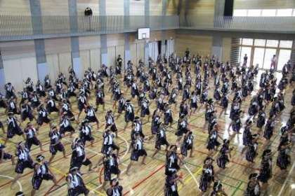 明日はそろいの法被に身を包んだ女子全員によるソーランに大きな拍手をお願いいたします。写真は、試着の様子と体育館での練習の1コマです。
