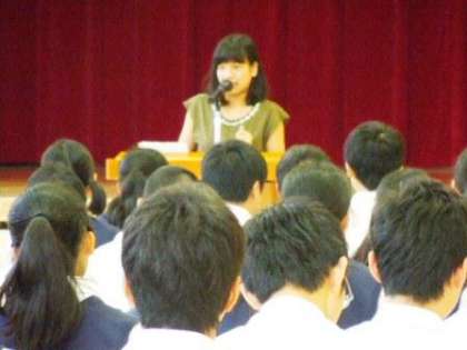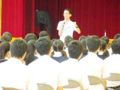 卒業して6年の先輩お2人に来ていただきました。大学生3年生と社会人1年目のお2人です。夢や目標は変わらない人もいれば、勉強や社会経験を重ねていく中で、変わることも多い。その都度最善を尽くすことが大切だというお話。今頑張っていること、今抱いている将来の夢などについても語っていただきました。若いお2人ですが、生徒に人生について語っていたと感じました。