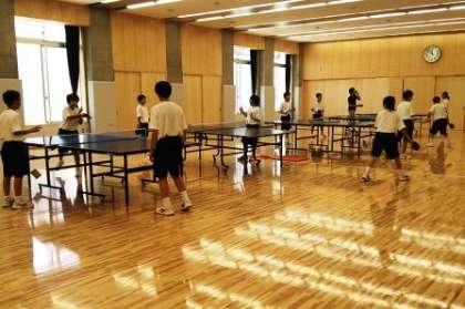 第2体育館で、和気藹々と練習している卓球部。審判がついて試合形式で練習したり、サーブ練習専用の台で練習するなど、工夫して取り組んでいます。先生も一緒に練習しています。暑さに負けず頑張ってくださいね。