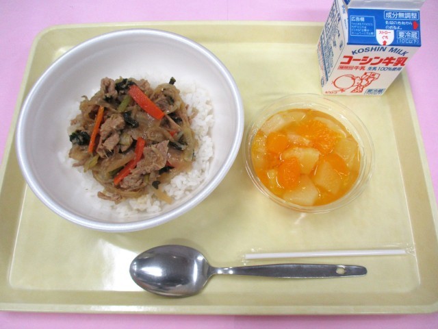 プルコギは古くから伝わる韓国の伝統的な料理の一つで、醤油ベースの下味をつけたお肉と野菜を一緒に炒め煮にして作る料理です。今日はプルコギをごはんにのせて丼ぶりにして提供しました。