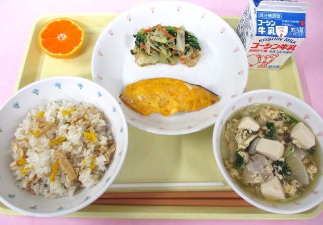 11月3日は「文化の日」です。自由と平和を愛し、文化を進める日として定められました。昔から日本で親しまれている菊の花は、文化の日の頃に全盛期であることから、「菊薫る文化の日」といわれることもあるそうです。給食では、1日遅くなりましたが、文化の日の行事食として、黄色い食用菊で彩った「菊花ごはん」、みかんを横半分に切った切り口が菊の花に見える「菊花みかん」を提供しました。
