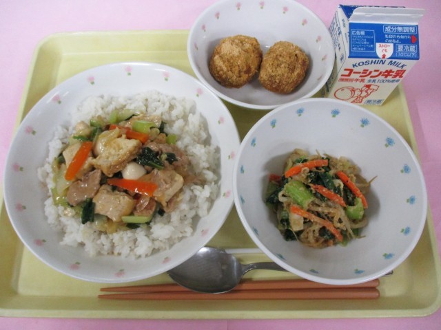 今日は小松菜一斉給食です。小松菜一斉給食とは、地域の特産品「小松菜」をより知ってもらい、子どもたちに農業についての理解を深めてもらいたいという思いから、地元で生産された小松菜を給食の食材として使用する取り組みです。毎年、JA東京スマイル農業協同組合さんより無償で小松菜が提供されています。今年度は、松江地区14校の栄養士が協力し考えた、献立を実施しました。