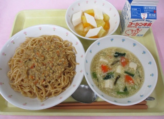 今日のデザートには、手作りの牛乳寒天が入っています。寒天は、テングサやオゴノリなどの海藻が原料です。よく加熱して煮溶かすことがポイントで、常温でも固まります。ゼラチンを使っても作ることができますが、加熱しすぎは禁物で、冷蔵庫などでしっかり冷やさないと固まりません。どちらも砂糖を加えるとよく固まり、レモン汁やオレンジジュースなどの酸味の強い物を加えると固まりにくくなります。