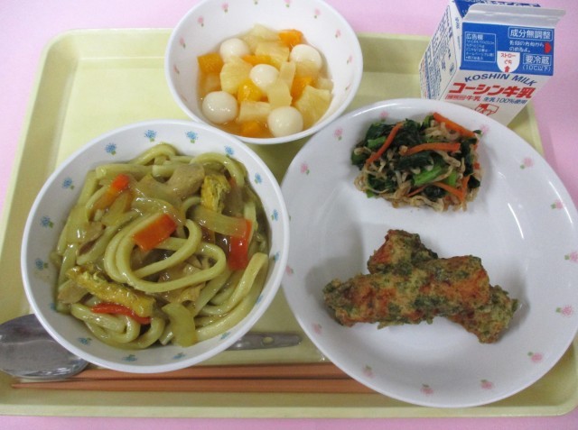 今日のカレーうどんは、豚肉や油揚げ、たまねぎ、にんじん、長ねぎなどの野菜を使って作りました。かつおの厚削りと昆布でとっただし汁で材料を煮て、カレー粉と醤油などで味付けしています。最後に水で溶いた片栗粉を加えてとろみをつけました。