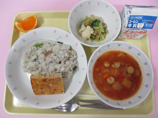 ミートローフは、ひき肉や玉ねぎなどで作ったタネをローフ型に入れてオーブンで焼いた料理のことです。給食では、四角に切って提供しますが、通常は、1cm幅程度にスライスされてから提供されることが多く、デミグラスソースなどのソースをかけて食べるのが一般的です。今日の給食ではしっかり味付けをしてから焼き上げたのでソースがなくても食べられるようにしました。