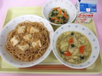 また、今日は鹿児島県の郷土料理を提供しました。「つけあげ」は鹿児島県特有の呼び方で、他県では「さつまあげ」「てんぷら」「揚げかまぼこ」などと呼ばれています。「つけあげ」の歴史は古く、江戸時代に薩摩藩28代当主・島津斉彬(しまづなりあきら)が、諸藩に古くから伝わる「紀州はんぺん」や「かまぼこ」の製法にヒントを得て、暖かくて湿度の高い鹿児島の風土に適する、保存性の高い揚げ物料理を考案させたという説や、琉球料理の揚げかまぼこである「チキアギ」が薩摩との盛んな交流の中で伝わり、鹿児島の方言によって「つけあげ」になったという説があります。「つけあげ」は、魚のすり身に豆腐や地酒を混ぜて油で揚げて作ります。砂糖を入れて甘口に仕上げるのも特徴です。さつま汁は、鶏肉を使った具だくさんなみそ汁です。鹿児島県は古くから鶏の飼育が盛んであり、『薩摩旧伝集』によると、鶏をしめて煮て食べる風習は古くからあったとされています。昔は祝いの席など特別な日に作られることが多かったのですが、現在はそのような決まりはありません。具だくさんで体が温まるため、寒い冬によく食べられているようです。また、味付けや鶏肉以外に入れる具材は、家庭や季節によって異なります。