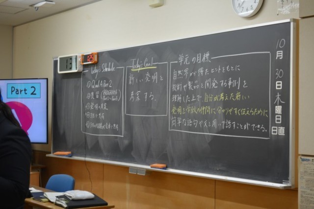 葛西小学校の教員や他校からの先生方も来校した研究授業で、内容は自分が考えた新しい発明を学級の仲間にわかりやすく伝えるというもので生徒は楽しく授業に参加していました。