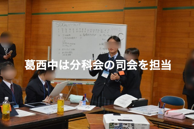 区内全中学校32校の生徒会長が大集合!! 自校の取組や課題、そして中学生議会のテーマでもあったSDGsへの取組などを話し合いました。SDGsのカードゲームで和んだ後、4つの分科会に分かれて活発な意見が交わされました。東京東ロータリークラブ・アクトの皆さんの協力もあり、約3時間の交流でしたがとても有意義な会となりました。