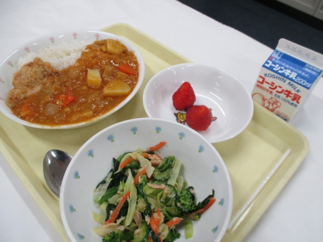 給食室自慢のカレーライスに ゲン担ぎとして「豚ヒレカツ」を添えました。