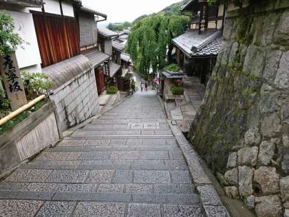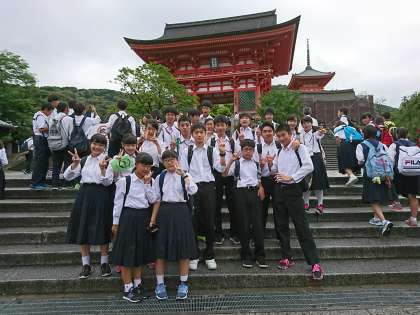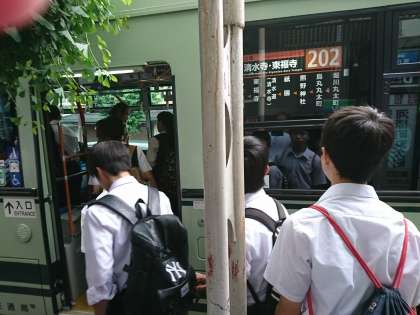 清水寺に行く班と一緒のバスに乗りました。バスは修学旅行生で一杯です。どの学校もマナー良く乗車していました。清水寺への参道はすでに大勢の観光客で賑わっていました。入り口の階段で数班に出会い、集合して一枚撮りました。その後、しっとりと雨に濡れた静かな三年坂で一枚。