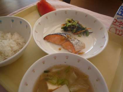 今日は昨日の最高気温を上回り 東京でも30度の真夏日を超える予報が出ています。暑さに体が慣れていないため 食欲が落ちてしまった人もいるかもしれません。水分補給もしっかりできていますか? 今日はデザートに水分たっぷりのすいかを提供しました。すいかは水分以外にエネルギーやミネラルを補うことができるので たくさんの汗をかく夏にはおすすめの果物です・・・。