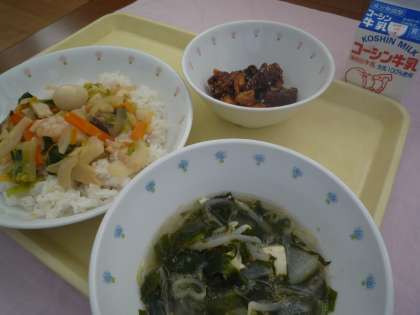 中華丼には たくさんの野菜が入っていますが どのクラスもしっかりと食べていました。わかめスープにも だいこん もやし 長ねぎなどの野菜が入っています。野菜を毎日しっかりと食べましょう!