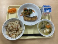 麦ごはん牛乳金目鯛の塩焼き揚げじゃが入り金平 わかめのみそ汁