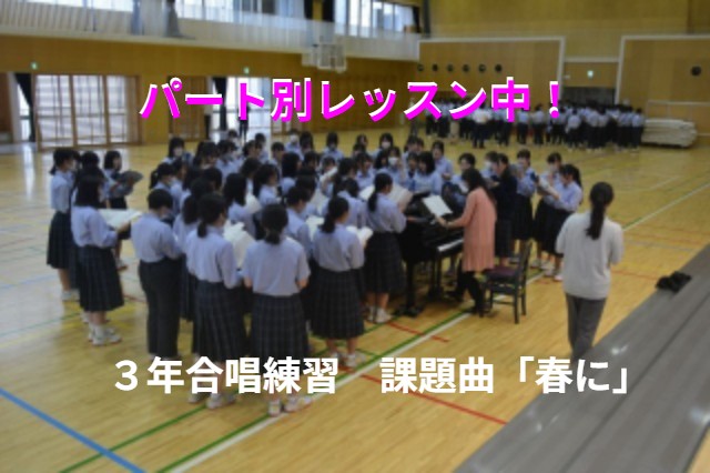 屋内運動場割り当ての三年生の練習を覗いてみました。パートリーダーを中心に主体的にパート別練習に取り組む様子が見られました。その後、全員での合わせ練習は、それぞれのパートが重なり合いとてもきれいなハーモ...