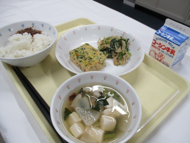 ごはん・エコふりかけ 牛乳千草卵焼き小松菜のごまみそ和え 豆腐のすまし汁今日はS...