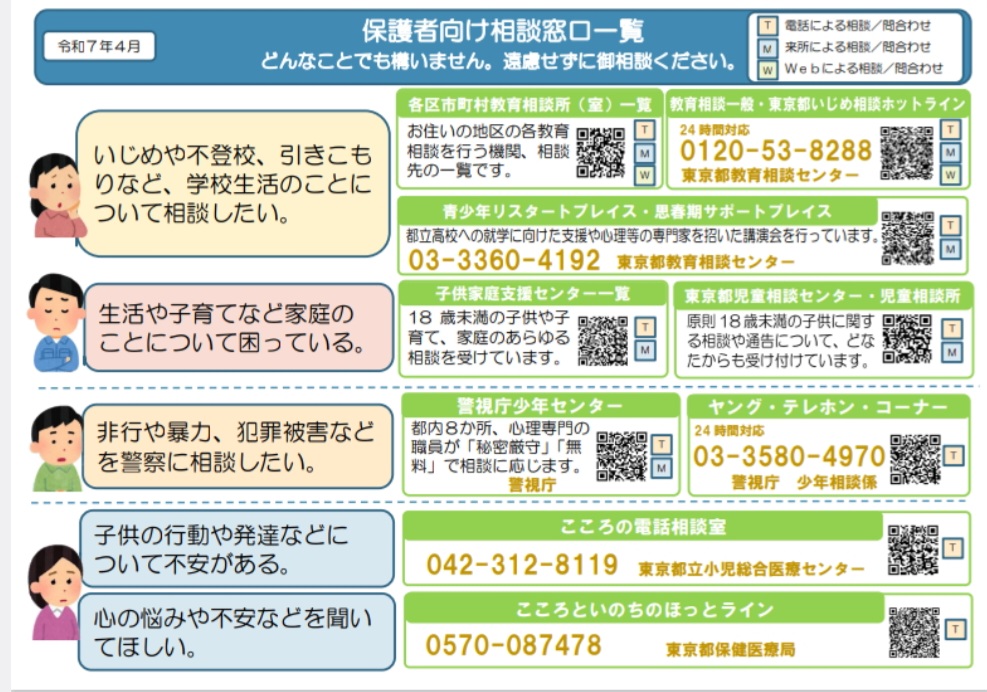 「保護者相談窓口」と「交通安全情報」を添付いたしますので、必要に応じてご活用ください。