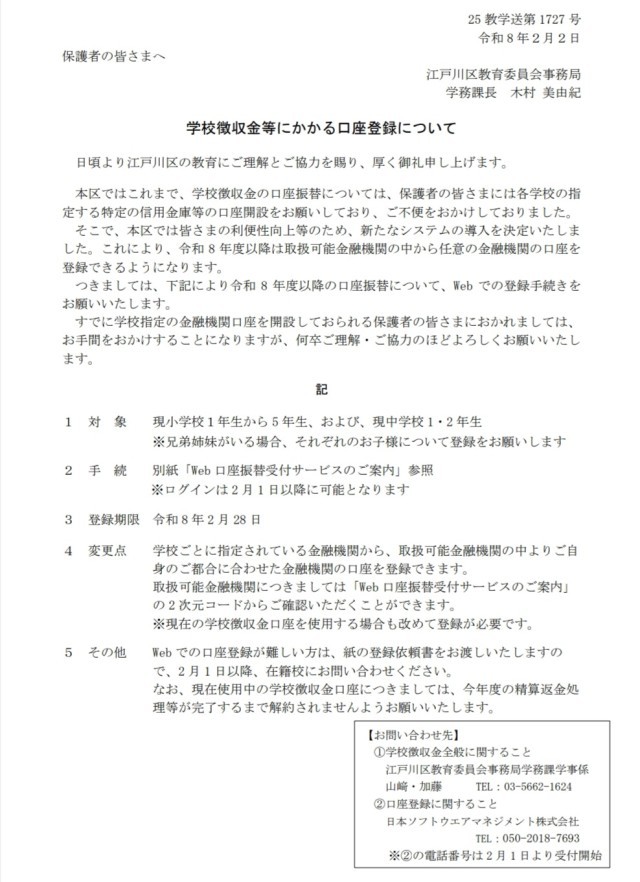 江戸川区では学校徴収金等関して、皆さまの利便性向上等のため、新たなシステムの導入を決定いたしました。これにより、令和 8 年度以降は 取扱可能金融機関の中から 任意の金融機関の口座を登録できるようになります。詳細は添付資料をご確認ください。