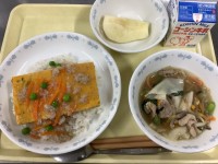 鯛めし・わかさぎのかりんとう揚げ・里芋のそぼろ煮・かきたま汁・雪見だいふく・牛乳