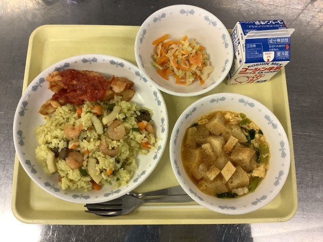 9月24日(水)の給食は、パエリア、パタタス・ブラバス(フライドポテトのトマトソースかけ)、キャロットラペ、ソパ・デ・アホ(ガーリックスープ)、牛乳 でした。