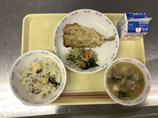 9月25日(木)の給食は、さつまいもごはん、いわしのさざれ焼き、小松菜のおひたし、豚汁、牛乳 でした。