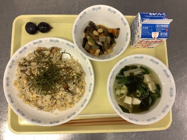 9月26日(金)の給食は、さんまのひつまぶし、五目豆、豆腐とわかめのすまし汁、巨峰、牛乳 でした。