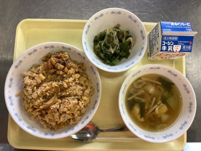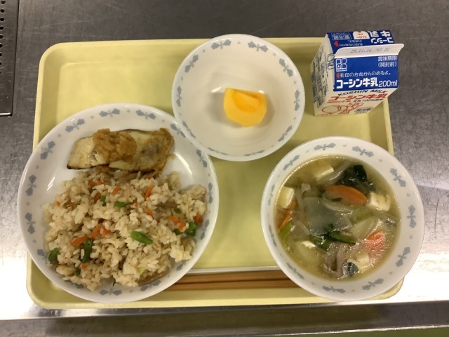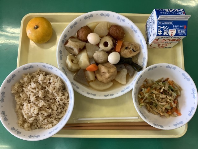 11/6(木) まいたけごはん ほっけ焼き 豚汁 柿 牛乳 𩸽(ほっけ)は、漢字で書くと魚へんに「花」と書きます。これは、幼魚が青緑色で蒸れて泳ぐ姿が花のように見えることに由来します。ほっけは、高たんぱく質・低脂質で、脳の働きを助けるEPA、DHAが豊富です。来週の期末考査に向けて、ほっけを食べて集中力をアップさせましょう! 11/7(金) 茶めし おでん かみかみサラダ みかん 牛乳 明日、11月8日は「いい歯の日」です。給食では、噛みごたえのある、さきイカやゴボウの入った「かみかみサラダ」を作りました。よく噛むことで唾液がたくさん出て、虫歯や歯周病を防ぐ効果が期待できます。