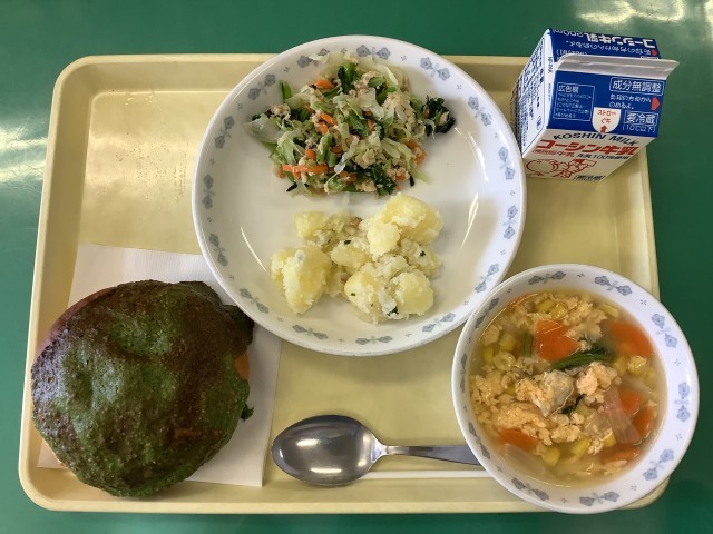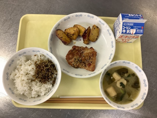 11/11(火) 麦入りごはん おかかと小松菜のふりかけ 鶏肉のごま焼き もやしのみそ汁 大学芋 牛乳 今日、11月11日は「もやしの日」です。まっすぐ伸びるもやしが、縦に並んだ「1」のように見えることから、もやし生産者協会によって制定されました。 もやしは豆を発芽させて作ります。普段食べているもやしの豆は、「緑豆(りょくとう)」「大豆」「黒豆」の3種類に大きく分けられます。緑豆は中国原産で青小豆とも呼ばれ、春雨の原料としても知られている豆です。おなじみの大豆は特に栄養価が高いとされる豆付きのもやしに成長します。また、黒豆(ブラックマッペ)は、煮豆に使われる黒豆より小豆に近い品種です。 11/14(金) 小松菜ビスキュイパン 粉吹き芋 こまツナサラダ イタリアンスープ 牛乳 ビスキュイパンとは、パンの上にビスケット生地を乗せて焼いたパンのことです。甘くて香ばしい味わいが特徴で、メロンパンとよく似たものです。今日は、小松菜をピューレ状にして、ビスキュイ生地と一緒に練り込んで作りました。味わって食べてくださいね。