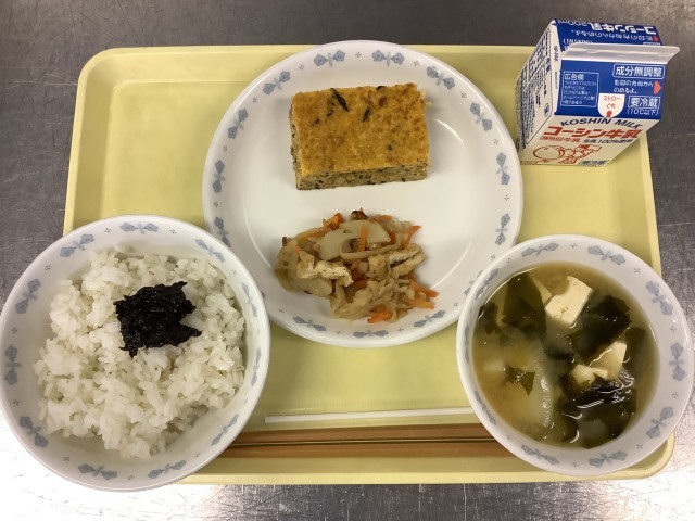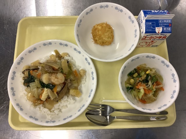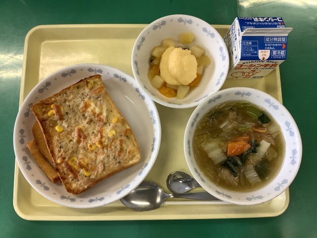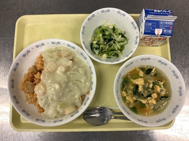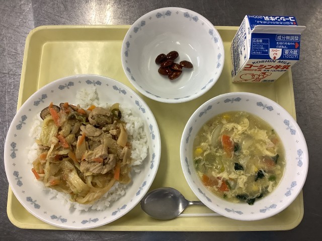 12/16(火) チキンライスのエビクリームかけ グリーンサラダ 小松菜と玉子のスープ 牛乳 「エビクリームライス」は、東京都足立区で考案された給食のメニューで、ホワイトクリームにたっぷりのエビが入ったソースをご飯にかけて味わいます。 12/17(水) 麦入りごはん のりの佃煮 厚焼き玉子 切干大根煮 わかめのみそ汁 牛乳 切り干し大根は、カルシウム、カリウム、鉄分、食物繊維などが豊富で、生の大根に比べて栄養が凝縮されています。特にカルシウムは生大根の20倍近く、成長期の皆さんに食べてもらいたい食品です。今日は、出汁と醤油、砂糖、みりんで炒め煮にしました。 12/18(木) ツナマヨコーントースト エコラスク 肉団子と春雨のスープ フルーツのカスタード添え 牛乳 カスタードは給食室で一から手作りしています。卵、牛乳、グラニュー糖、そしてコーンスターチを入れて20分ほど湯煎して作ります。湯煎中に混ぜ続けるのがポイントです。調理員さんが頑張って作ってくれました!感謝していただきましょう。 12/19(金) ホイコーロー丼 中華風コーンスープ 黒糖アーモンド 牛乳 回鍋肉(ホイコーロー)の「回鍋(ホイコー)」は、「鍋に戻す」という意味で、一度火を通した肉をもう一度鍋に戻す調理法に由来します。中国四川省(しせんしょう)発祥の料理です。日本では、キャベツと甘辛い味噌味が定番ですが、本場四川(しせん)では葉ニンニクと豆板醤(トウバンジャン)が使われ、より辛く、塩辛い味付けが一般的です。