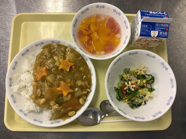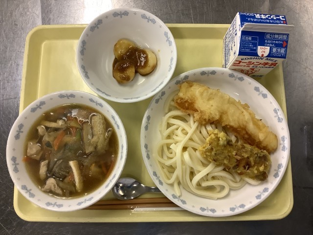 12/23(火) クリスマスチキンカレー クリスマスマカロニサラダ クリスマスフルーツポンチ 牛乳 今日は、給食委員コラボ祭(フェスタ)第二弾です!「クリスマス」をテーマに2年生の給食委員がメニューを考案しました。「クリスマスチキンカレー」は、クリスマスの定番であるチキンと給食の大人気メニューであるカレーを組み合わせました。ブロッコリーと星型の人参でツリーをイメージしています。 「クリスマスマカロニサラダ」は、色鮮やかで華やかな見た目がクリスマスにぴったりのサラダです。マカロニは雪の結晶の形にしました。 「クリスマスフルーツポンチ」はクリスマスツリーの装飾をイメージして赤や黄色の寒天や雪を表現した白玉を入れました。 3人のこだわりが詰まったメニューになりました。見た目も楽しみながら食べてくださいね。 12/24(水) しっぽくうどん いかの天ぷら 竹輪のカレー揚げ みたらしごま団子 牛乳 今日は年越し給食です。大晦日(12月31日)は、1年の締めくくりとなる日です。今年の苦労を断ち切り、新年への願いを込めて、年越しそばを食べる風習があります。給食では、「しっぽくうどん」を作りました。皆さん良いお年をお迎えください。