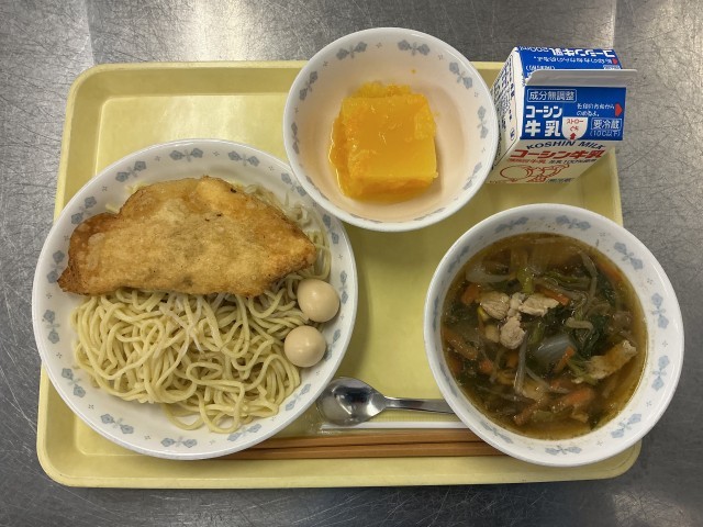 今日の「揚げぎょうざ」は3年1組のリクエスト、そして「醤油ラーメン」は、QP(給食ポイント) No. 1クラスの1年4組のリクエストです。