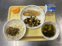 9月29日の給食は、さつま芋ごはん、いわしのさざれ焼き、小松菜のおひたし、豚汁、マスカットでした。