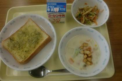 10月3日の給食は、しらすピザトースト、ニューイングランド風クラムチャウダー、かみかみサラダでした。
