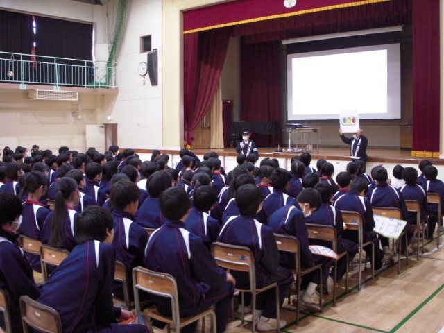 11月20日(木)第1学年では、交通安全教室が開かれました。葛西警察署から講師をお呼びし、安全に配慮する必要性をはじめ、実際に交通事故の現場に直面する方々からの貴重なお話を伺うことができました。自転車ヘルメットの重要性も話されていました。まだお持ちでない方は、ご家庭でヘルメットの購入をご検討ください。